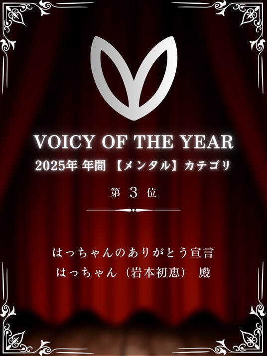 「株式会社愛とーと」(福岡県那珂川市)の代表・岩本初恵(愛称:はっちゃん)が配信するVoicyチャンネル「はっちゃんのありがとう宣言」が、2025年の年間トータルランキング「VOICY OF THE YEAR」の「差し入れ数」部門で2025年の年間第1位に輝きました。この分野での1位獲得は2年連続の快挙となりました。