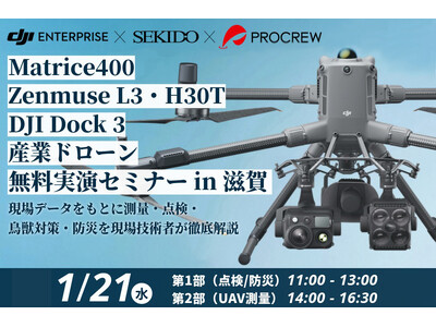DJI(ディージェイアイ)正規販売代理店としてドローンビジネスの最先端を支える株式会社セキド(本社:東京都港区、代表取締役:大下貴之)は、株式会社プロクルー(本社:滋賀県長浜市、代表取締役:酒井正裕)と共催で、2026年1月21日(水)に滋賀県米原市で「最新DJI産業用ドローン 点検/UAV測量 無料実演セミナー」を開催いたします。本セミナーでは、高所点検・防災・ICT施工・測量など