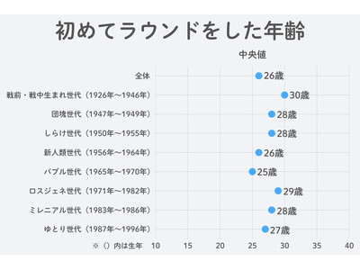 初めてラウンドした年齢の中央値は全体で26歳となりました。最も高齢の戦前・戦中生まれ世代(1926年~1946年生まれ)で30歳、最も若いゆとり世代(1987年~1996年生まれ)で27歳と、わずか3歳の差にとどまる結果となりました。高度経済成長期からデジタルネイティブ世代まで、大きな時代背景の変化があった中でも、ゴルフを始める年齢に劇的な差は見られませんでした。