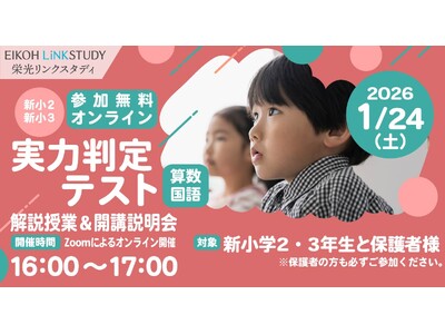 株式会社増進会ホールディングス(Z会グループ)のグループ会社、株式会社栄光(本社:東京都千代田区 代表取締役社長:下田勝昭)が運営するオンライン進学塾「EIKOH LiNKSTUDY(栄光リンクスタディ)」は、新小学2・3年生(現小学1・2年生)対象の「実力判定テスト」を実施します。また、テストのオンライン解説授業と新年度開講説明会を、2026年1月24日(土)に行います。