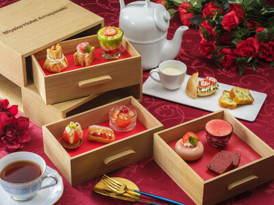 オリジナルの木箱の引き出しを開けると、華やかないちごスイーツが美しく並び、目にも楽しい優雅なティータイムを演出します。いちごのタルト、いちごのミルフィーユ、いちごのエクレア、いちごと神戸ワインのジュレなど、いちごの甘みと酸味を活かしたスイーツをラインナップ。さらに、いちごのクレープ巾着包みやいちごとチョコレートのドームといった、食感や味わいの変化も楽しめる品々を揃えました。セイボリーには蒸し鶏のベーグルサンドやクラムチャウダーなどを取り入れ、甘さの合間にほどよい満足感を添えています。