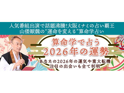 大阪ミナミの占い覇王として数々の番組やメディアで人気を博している山倭厭魏(やまとおうぎ)による本格算命学サイト『山倭厭魏の算命学』にて、この度算命学で占う『2026年の運勢占い』を無料公開いたしました。生年月日を入力するだけで、2026年にあなたに訪れる運勢や今後の転機、未来の重要な出来事、仕事運、恋愛運などを占うことができます。