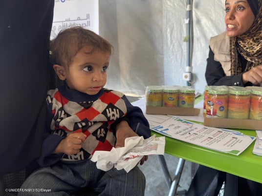 ガザ市にあるユニセフ支援の栄養治療拠点で、栄養状態の経過観察を受ける1歳のアリちゃん。栄養不良と診断されていたが、2カ月間の治療を経て回復しつつある(パレスチナ、2025年12月8日撮影) (C) UNICEF/UNI913152/Eleyan