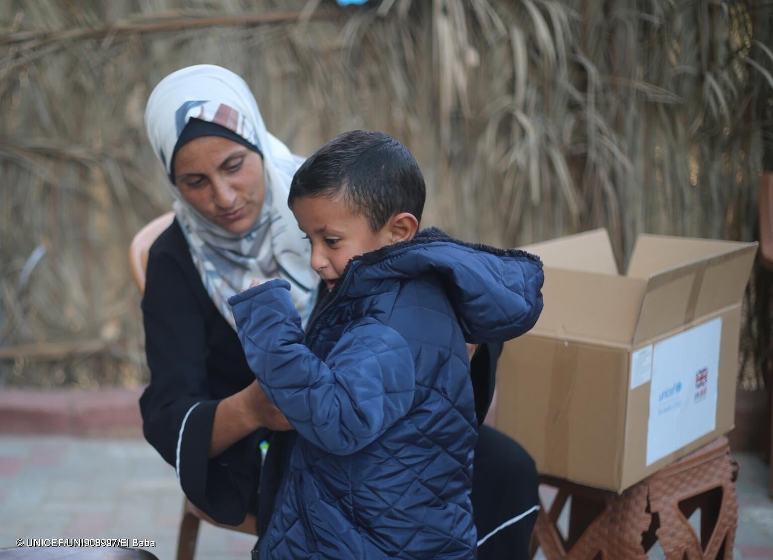 気温が下がり始めたデルバラハで、温かい上着を着せてもらう子ども。ユニセフは、ガザ地区全域で、子どもたちに防寒着を配布している(パレスチナ、2025年11月18日撮影) (C) UNICEF/UNI908997/El Baba