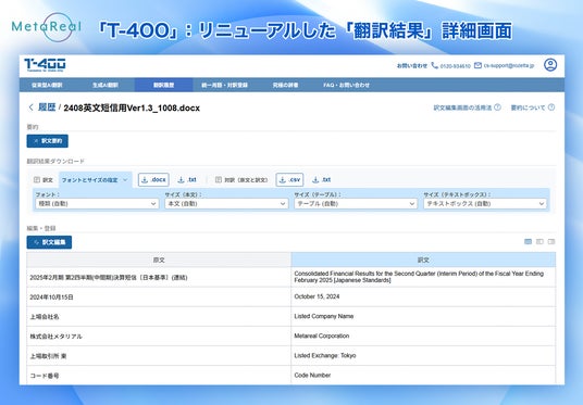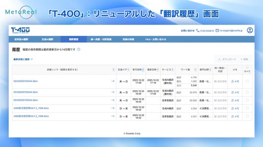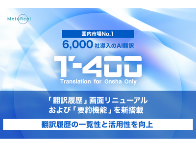 株式会社メタリアルグループで、国内市場No.1※のAI翻訳サービスを開発・提供する株式会社ロゼッタ(代表取締役:五石 順一)は、2025年12月、高精度AI翻訳「T-4OO(ティーフォーオーオー)」において、「翻訳履歴」画面のリニューアルおよび新たに「要約機能」を追加したことをお知らせいたします。