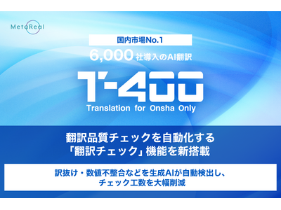 株式会社メタリアルグループで、国内市場No.1※のAI翻訳サービスを開発・提供する株式会社ロゼッタ(代表取締役:五石 順一)は、2025年12月、高精度AI翻訳「T-4OO(ティーフォーオーオー)」において、新機能「翻訳チェック」を追加したことをお知らせいたします。