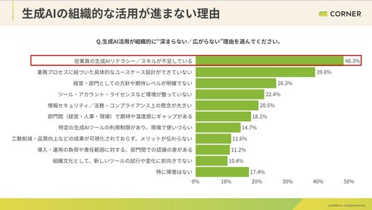 従業員のリテラシー/スキル不足が圧倒的に多く挙げられており(48.1%)、業務プロセスと紐付いた具体的なユースケース設計ができていない(39.0%)が次に多い。全体的には業務・組織設計に起因する要因が続いている。生成AIは導入されつつある一方で、それを組織の業務や意思決定に組み込む設計が追いついていない構造が確認できる。