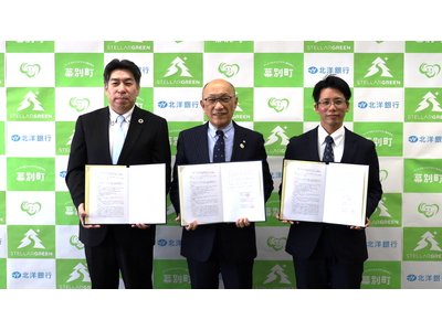 森林カーボンクレジット創出の支援事業を展開する株式会社ステラーグリーン(本社:東京都中央区、代表取締役社長 兼 CEO:中村 彰徳、以下「ステラーグリーン」)と提携先である株式会社北洋銀行(本店:北海道札幌市、取締役頭取:津山 博恒、以下「北洋銀行」)は、北海道幕別町(町長:飯田 晴義、以下「幕別町」)の環境価値を活用した「ゼロカーボンシティまくべつ」の実現と地域経済の活性化を図ることを目的として、2025年12月23日(火)に三者間で連携協定を締結しました。