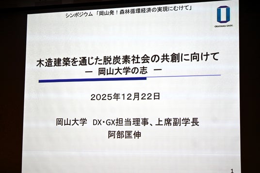 このたび、2025年12月22日(月)に岡山大学主催・一般社団法人プラチナ構想ネットワーク共催のシンポジウム「岡山発!森林循環経済の実現に向けて」が岡山大学創立五十周年記念館にて開催され、パネルディスカッションにおいて、当社代表取締役社長 窪田健太郎がパネリストとして登壇いたしました。パネルディスカッションでは、窪田を含む計6名のパネリストにより、岡山県での森林循環経済の実現・地域森林ビジョンの促進に向けた議論が行われました。