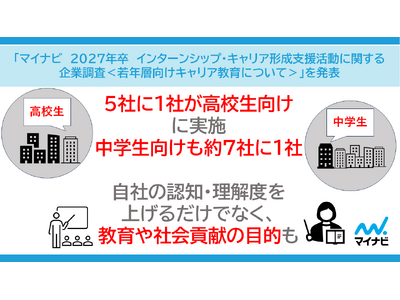 株式会社マイナビ(本社:東京都千代田区、代表取締役 社長執行役員:土屋芳明)は、大学1、2年生向けのキャリア教育や、より若年層に向けたキャリア教育への企業の取り組み状況をまとめた「マイナビ 2027年卒インターンシップ・キャリア形成支援活動に関する企業調査<若年層向けキャリア教育について>」の結果を発表しました。