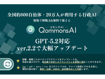 生成AIの社会実装を牽引するPolimill株式会社(本社:東京都港区/代表取締役:伊藤あやめ・谷口野乃花)は、2025年12月23日、行政向け生成AI「QommonsAI(コモンズAI)」の最新バージョン ver.2.2 をリリースいたしました。
