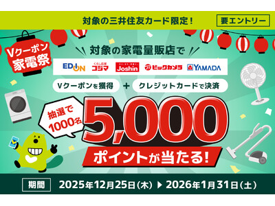 三井住友カード株式会社(本社:東京都江東区、代表取締役 社長執行役員 CEO:大西 幸彦、以下:三井住友カード)は、2025年12月25日(木)から2026年1月31日(土)にかけて、対象カード限定で「Vクーポン家電祭キャンペーン」を開始します。