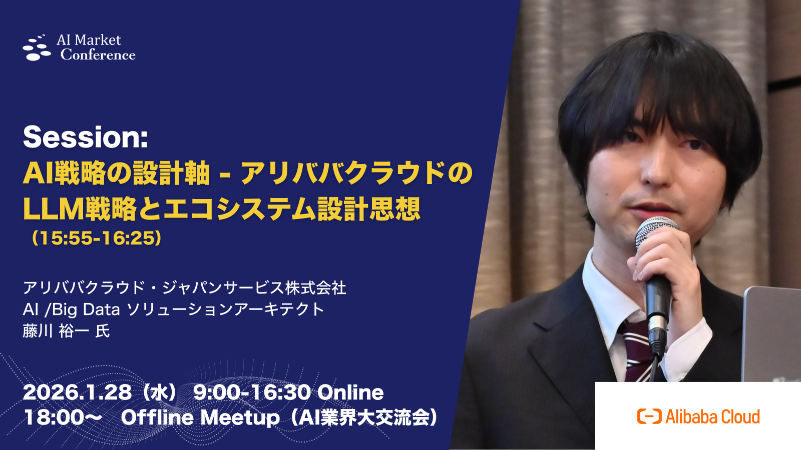 最適なAI会社やAIサービスの選定を支援するコンシェルジュサービス「AI Market」を運営するBizTech株式会社(東京都豊島区、代表取締役 森下 佳宏)が主催する、1月28日開催の国内最大級AIカンファレンス『AI Market Conference 2026』に登壇するアリババクラウド・ジャパンサービス株式会社 藤川 裕一 氏の講演内容をお知らせ致します。