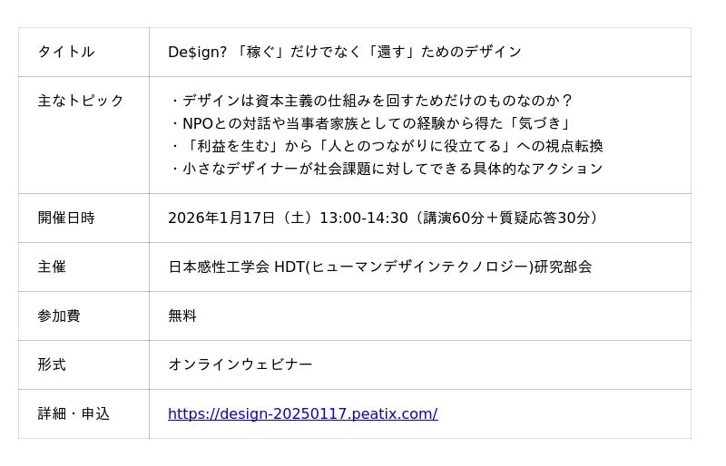 インクルーシブデザインスタジオCULUMU(運営:株式会社STYZ、本社:東京都渋谷区、代表取締役:田中辰也、以下「CULUMU」)の事業責任者である川合俊輔は、2026年1月17日(土)に開催される日本感性工学会 HDT(ヒューマンデザインテクノロジー)研究部会主催のウェビナーに登壇いたします。