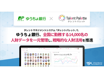 株式会社プラスアルファ・コンサルティング(本社:東京都港区、代表取締役社長:三室克哉、証券コード:4071)は、同社が提供するデータに基づく人材の活用、人的資本経営の実践、人事業務のDX化、リスキリングの推進などを目的に、多くの大手エンタープライズ・中堅企業で導入が進むシェアNO.1(*)のタレントマネジメントシステム 「Talent Palette(以下:タレントパレット)」 の株式会社ゆうちょ銀行(本社:東京都千代田区、取締役兼代表執行役社長:笠間 貴之、以下:ゆうちょ銀行)への導入事例を公開しました。