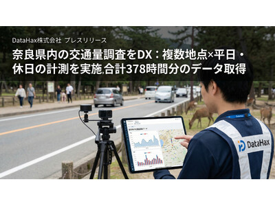 DataHax株式会社(本社:東京都新宿区)は、奈良県内にて交通量調査を実施しました。公園出入り口における計測(平日4箇所・休日5箇所、合計90時間)に加え、県内道路での計測(地点非公開:平日12箇所・休日12箇所、合計288時間)を行い、