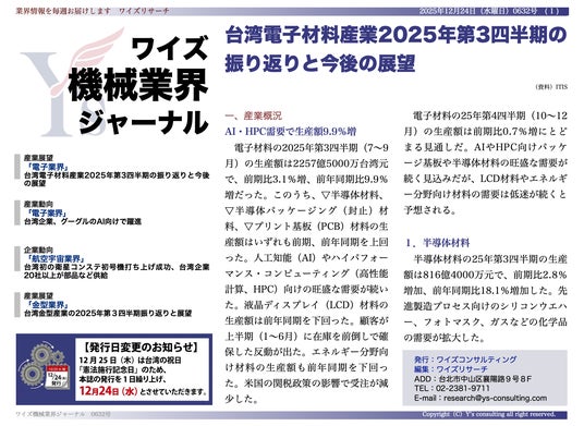 ワイズコンサルティング グループ(本社:中華民国台北市、代表取締役:吉本康志)は台湾機械業界専門誌「ワイズ機械業界ジャーナル」の2025年12月第4週号を発行しました。