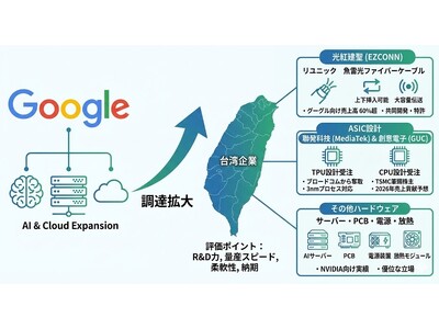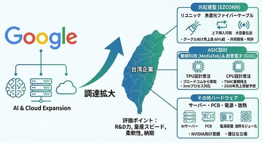 グーグルはAI・クラウド事業拡大に伴い、研究開発力と量産対応力を重視し、台湾企業の採用を拡大。光紅建聖(EZCONN)は光通信部品で売上の6割超をグーグル向けが占め、聯発科技(メディアテック)や創意電子(GUC)はTPUやCPU向けASIC設計を受注。サーバー、PCB、放熱、電源分野でも台湾メーカーの供給網入りが進んでいる。