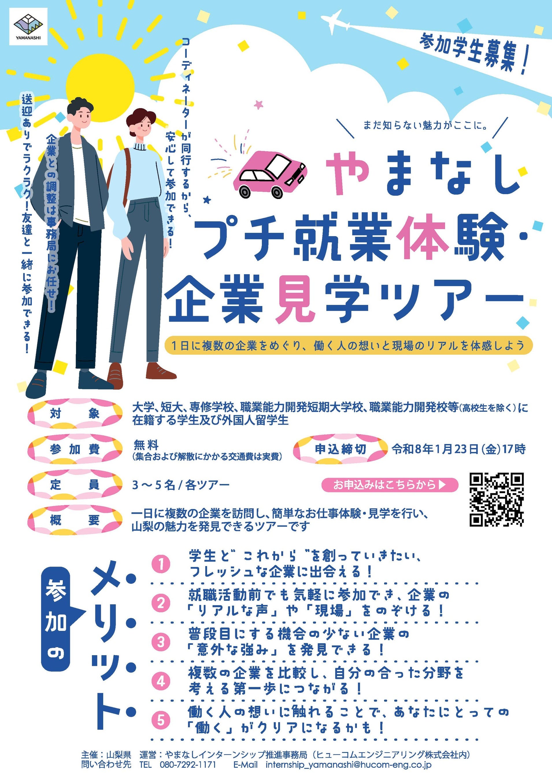 やまなしプチ就業体験・企業見学ツアー」を開催します。本ツアーでは、県内企業を1日で複数訪問し、働く人の想いや現場の様子を体感できます。企業との調整や送迎は事務局がサポートするため、安心して参加でき、就職活動前の業界研究やキャリア形成に役立つ有意義な機会となります。