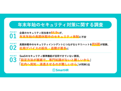 クラウド人事労務ソフト「SmartHR」を運営する株式会社SmartHR(本社:東京都港区、代表取締役CEO:芹澤 雅人)は、従業員数500名以下の企業に勤める情報システム担当者216名を対象に、年末年始のセキュリティ対策に関する調査を実施しました。