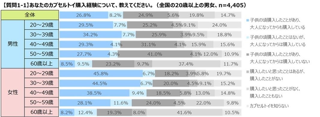 当社が2025年1月~2月に実施したインターネットアンケート調査では、20代・30代女性の2人に1人以上が、大人になってからカプセルトイを購入したことがある、ということが明らかになりました。さらに、すべての年代で男性よりも女性の方が大人になってからカプセルトイを購入している人の割合が高いことが明らかになりました。
