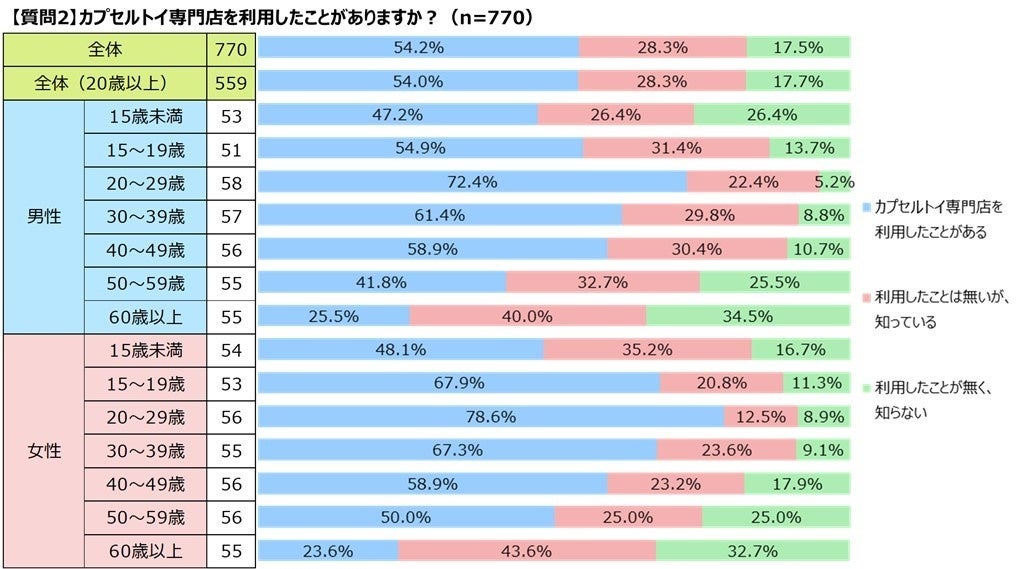 また、近年さまざまなショップが展開されているカプセルトイ専門店の認知度は8割を超えていることが分かりました。全体の5割以上の方が実際に専門店で購入したことがあると回答しており、カプセルトイ専門店が身近な存在として認知されつつあると推察されます。