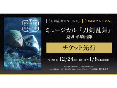 合同会社DMM.com(本社:東京都港区、PFカンパニーCEO:村中悠介、以下DMM)は、DMMグループの合同会社EXNOAが開発・運営、株式会社ニトロプラスが世界観・シナリオ・キャラクターデザインを担当している刀剣育成シミュレーション『刀剣乱舞ONLINE』を原案とする「ミュージカル『刀剣乱舞』 髭切 単騎出陣」につき、『刀剣乱舞ONLINE』ゲーム内チケット先行ならびに、「DMMプレミアム」会員向けチケット先行の申し込み受付を開始いたしました。