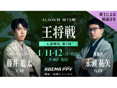 新しい未来のテレビ「ABEMA(アベマ)」は、「ABEMA PPV(アベマ ペイパービュー)」にて、『囲碁将棋チャンネル ALSOK杯第75期王将戦七番勝負』(主催:日本将棋連盟、特別協力:毎日新聞社、スポーツニッポン新聞社、特別協賛:ALSOK、協賛:囲碁・将棋チャンネル)を生配信することを決定いたしました。第1局の模様は、2026年1月11日(日)と1月12日(月祝)のそれぞれ8時40分より生配信いたします。