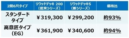 施工性を追求して大引や束柱、その他部品を削減したことにより、従来品よりお求めやすい価格に設定しました。全サイズでリーズナブルになり、代表サイズとして2間6尺サイズ(スタンダードタイプ)では従来品から価格比約93%を実現しました。