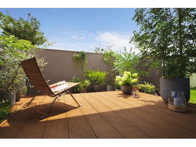 従来品と同様に硬度の高いポリプロピレンを原料とし、高い耐久性(耐候性・耐腐朽性・耐水性)と滑りにくさを確保。熱や衝撃に強く、日差しや荷重にさらされる屋外空間でも安心して長く使えます。また、原料の木粉は社内で出る木の端材を有効活用して省資源化に貢献します。デッキ材のすき間にモノが落ちない構造など、独自の特長でユーザーの要望に対応しています。