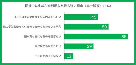 57%の学生(重複除外 240名)に面接中に生成AIを利用した最も強い理由を尋ねたところ、「頭が真っ白になることを防ぐため」(35%)が最多でした。次いで「他の学生も使っているので、自分も使わないと不利になるため」(24%)が続きました。