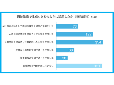調査対象418名のうち、生成AIを利用せずに面接準備を行った学生はわずか36%でした。実に64%が生成AIを用いて面接対策を行っていたことになり、すでに面接準備の主流がAI前提に移行している実態が浮き彫りになりました。