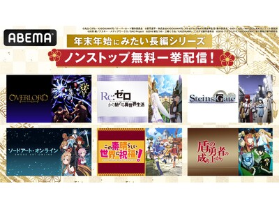 本企画では、特に人気が高い長編のシリーズ作品をピックアップし、12月26日(金)から順次無料配信いたします。対象となる作品は大人気異世界ファンタジー『Re:ゼロから始める異世界生活』の1st seasonから3rd seasonと関連作(※)や、主人公がタイムリープを繰り返しながら運命と戦う姿を描いた感動SFアニメ『STEINS;GATE』シリーズのほか、『この素晴らしい世界に祝福を!』第1期から第3期、『盾の勇者の成り上がり』第1期から第4期、さらに『ソードアート・オンライン』、『オーバーロード』を含めた計6作品です。また配信後は2週間、全話無料にてお楽しみいただけます。