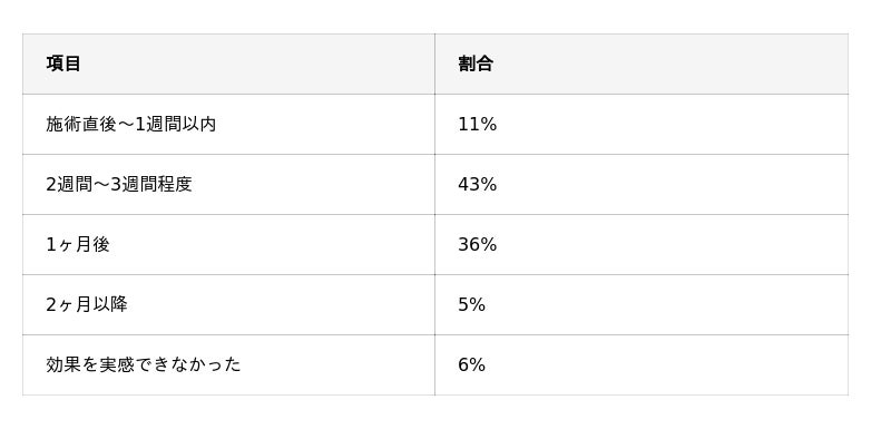 「2週間~3週間程度」と回答した方が最も多く、比較的早い段階で効果を実感している傾向が見られました。