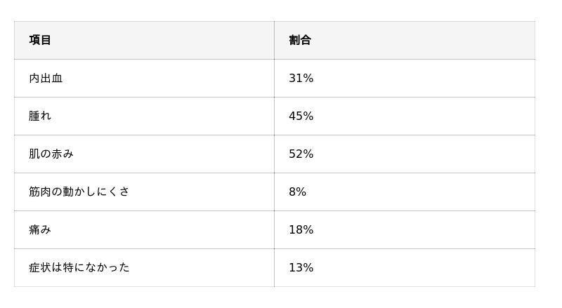 「肌の赤み」「腫れ」「内出血」が見られたという声が多く寄せられました。