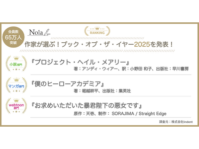65万人を超える作家が登録する創作プラットフォーム「Nola(ノラ)」を運営する株式会社indent(本社:東京都千代田区、代表取締役社長:釜形 勇気、以下「indent)は、2025年12月2日(火)~12月14日(日)の期間、Nolaにご登録いただく作家の皆さまに向けて『読書事情にかんするアンケート』を実施し、小説・マンガ・webtoonの3部門に分けて『今年一番面白かった作品』を調査した結果を受け、このたび、『作家が選ぶ!ブック・オブ・ザ・イヤー2025』を発表いたしますことをお知らせいたします。