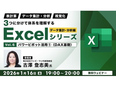 株式会社クリーク・アンド・リバー社(C&R社)は2026年1月16日(金)・30日(金)、普段からExcelを使用されている方を対象に無料のオンラインセミナー「『表計算』『データ集計・分析』『視覚化』3つに分けて体系を理解するExcelシリーズ データ集計・分析編 Vol.6/Vol.7」を開催します。