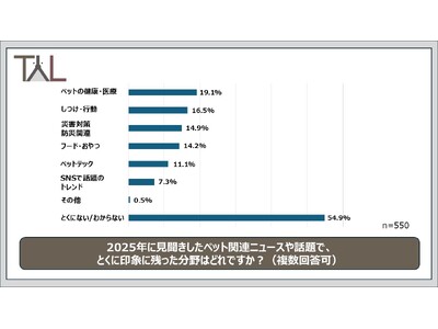 ペットの飼い主550名に「2025年に見聞きしたペット関連のニュースや話題のうち、特に印象に残った分野はどれですか?」と質問したところ、最多は「ペットの健康・医療(19.1%)」でした。次いで「しつけ・行動(16.5%)」と、日常生活に密接したテーマが続いています。一方で、3番目に多かったのは「災害対策・防災関連(14.9%)」で、台風や地震といった自然災害を背景に、ペットを含めた防災意識の高まりがうかがえる結果となりました。