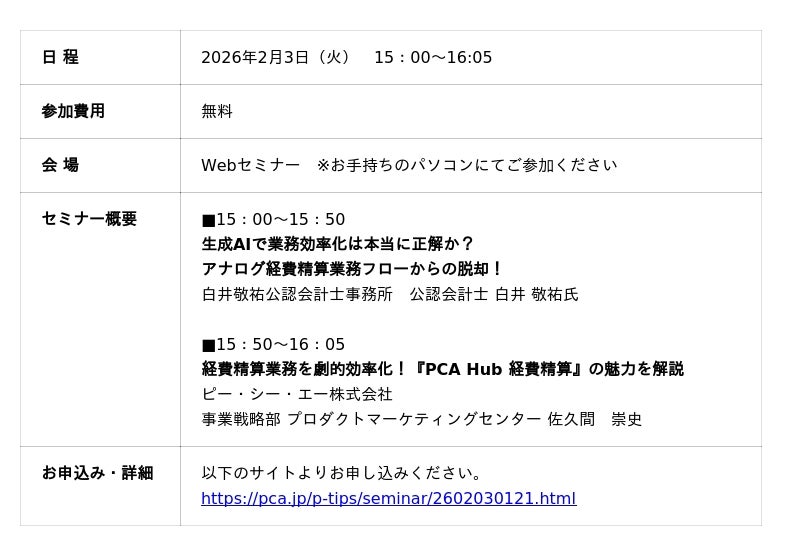 2026年2月3日には「公認会計士YouTuberくろいちゃんねる」を運営する公認会計士 白井 敬祐氏をゲストに迎え、生成AIを活用し最も賢く、安全に業務フローを整えるための「最適解(真の経理DX)」について、PCA主催のWebセミナーを開催いたします。