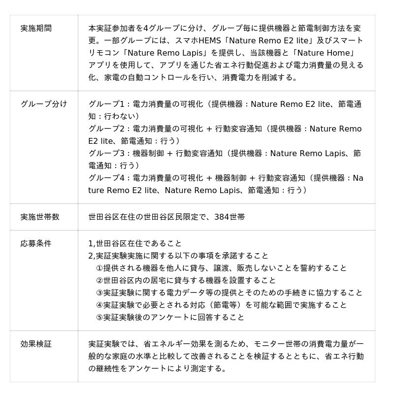 本実証は世田谷区民を対象に、無理をせず手軽に省エネ生活を実現することの検証を目的として、2025年7月1日(火)から2025年8月31日(日)まで実施をしました。実証参加世帯は、384世帯で、提供機器と節電制御方法の違いで4グループに分け、個人の我慢や努力だけに頼らない省エネの効果と継続性を検証しました。Natureは、電力消費量を可視化するスマホHEMS「Nature Remo E2 lite」と、赤外線リモコンを備えた家電を操作できるスマートリモコン「Nature Remo Lapis」を参加世帯へ提供し、家電の自動制御や「Nature Home」アプリを通じたプッシュ通知や電力消費量の可視化で行動変容を促しました。