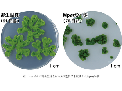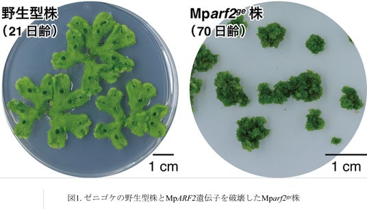 研究チームは、ARFにはオーキシンに応答して遺伝子発現を促進するAクラス(ゼニゴケではMpARF1)と抑制するBクラス(MpARF2)があることに着目し、MpARF2遺伝子の機能解析を行いました。
