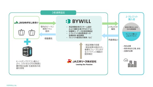 日本全国47都道府県のカーボンニュートラル実現を目指す株式会社バイウィル(本社:東京都中央区、代表取締役社長:下村 雄一郎、以下「バイウィル」)は、なめがたしおさい農業協同組合(本所:茨城県行方市、代表理事組合長:金田 富夫、以下「JAなめがたしおさい」)およびJA三井リース株式会社(本社:東京都中央区、代表取締役 社長執行役員:新分 敬人、以下「JA三井リース」)と、ピーマン栽培のビニールハウスにおけるヒートポンプ導入の実証実験及び事業化推進に関する連携協定を締結しました。