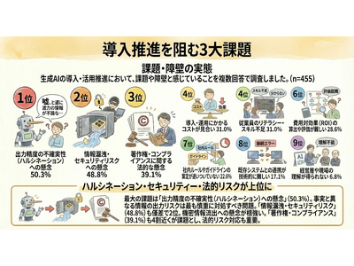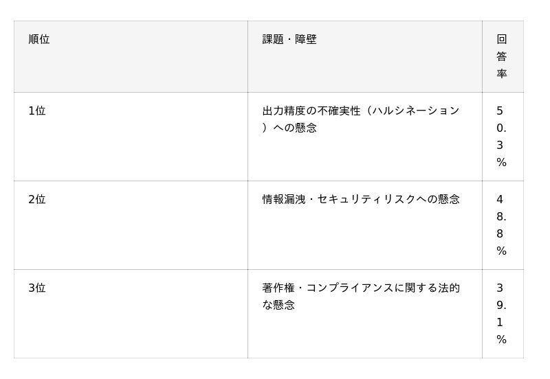 ハルシネーション(50.3%)」。生成AIが事実と異なる情報を出力するリスクが、業務活用における最大の障壁として認識されています。セキュリティリスク、法的リスクと合わせ、