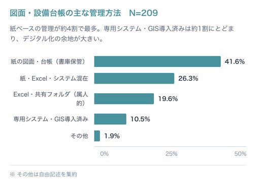 さらに、図面や設備台帳の管理方法は「紙が正本で書庫保管(41.6%)」が最多で、紙・Excel・専用システムの混在や属人的管理も一定数見られました。