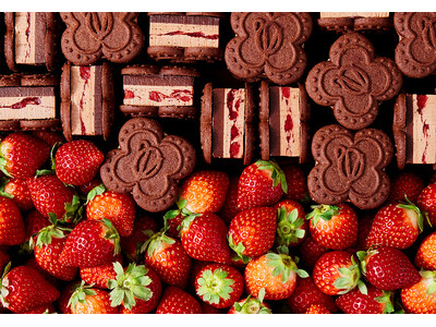 素晴らしい香りの苺「サンアンドレアス種」果肉を苺ピューレで煮込んだ苺コンフィチュールジュレ。自家製のショコラホイップバタークリームと、とろりとろけるショコラガナッシュも一緒に、贅沢な厚みのままココア香るクッキーではさみました。苺のジューシーな美味しさとダブルショコラが、濃厚にとろけあう極厚バターサンドです。