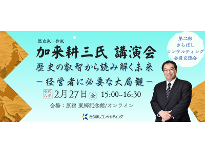 「金融にも強い総合サービス業」を将来像に掲げるきらぼしグループの株式会社きらぼしコンサルティング(本社:東京都港区、代表取締役社長 中野良明)では、2026年2月27日(金)、歴史家・作家として活躍する加来耕三氏の講演会および会員交流会を開催いたします。