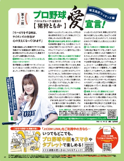連載「プロ野球“愛”宣言!」は、J:COMご加入者さま向け番組ガイド誌「ジェイコム マガジン」ならびに“エンタメをもっと楽しむWebマガジン”「J:magazine!」(読み:ジェイマガジン)で毎月日本全国のプロ野球ファンにお届けしています。著名人の球団ファンになったきっかけや、ご自身の“リアル”な「プロ野球の応援&観戦スタイル」を語ります。第11回は、「学生時代に西武ドームでアイスクリームの売り子をしながら応援していた」猪狩ともかさんの深すぎる“ライオンズ愛”をお楽しみいただけます。