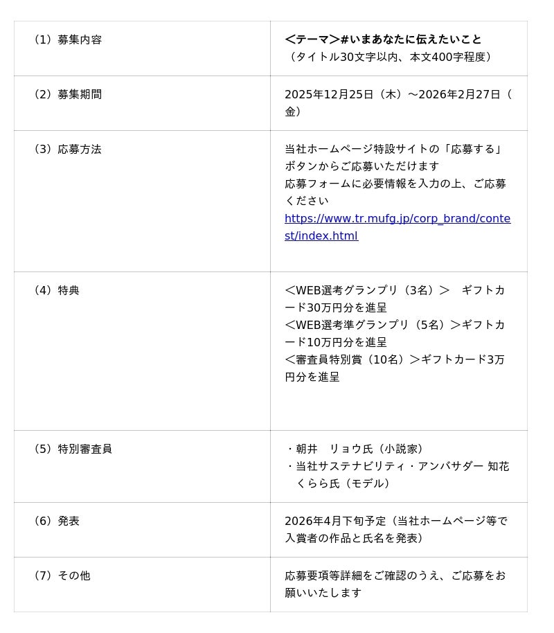 三菱UFJ信託銀行株式会社(取締役社長 窪田(くぼた) 博(ひろし)、以下 三菱UFJ信託銀行)は、2025年12月25日から2026年2月27日までの期間、「#いまあなたに伝えたいこと」をテーマとしたエッセイコンテスト(以下 本コンテスト)を開催いたします。