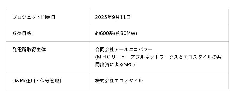 また、三菱HCキャピタルのグループ会社であるMHCリニューアブルネットワークス株式会社(代表取締役:鶴見 仁嗣/以下、「MHCリニューアブルネットワークス」)とエコスタイルは、低圧太陽光発電所の取得・集約を目的とした共同出資による特別目的会社(以下、「SPC」)を設立、第一号案件の取得に向けた事業を開始しましたのでお知らせします。