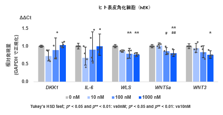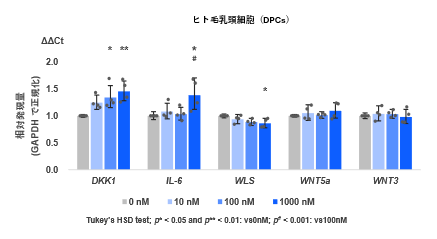 詳細な分子機序を解明するために、ヒト毛乳頭細胞(DPCs)※4及びヒト表皮角化細胞(hEK)※5を用いて、DHT添加時のWLSやWNT類の遺伝子変化量をリアルタイムPCR法で確認しました(図2、図3)。DPCsではWLS、hEKではWLSに加えてWNT5a※3、WNT3の有意な減少を確認しました。DKK1やIL-6は、DPCsがDHTに反応する際のポジティブコントロールとして使用いたしました。どちらもDHTにより増加しました。